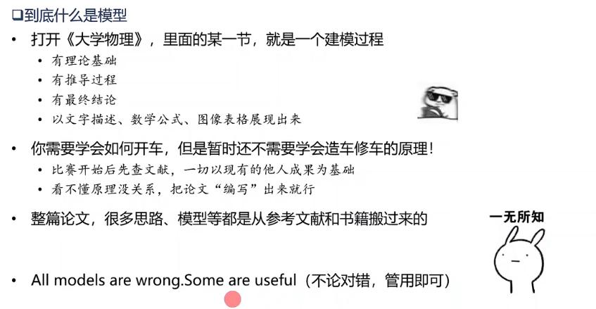 4.模型的建立。(一组公式和对每个变量的解释就是一个模型,看资料用自己的话复述一个简单模型,把题目中的变量带入模型中)